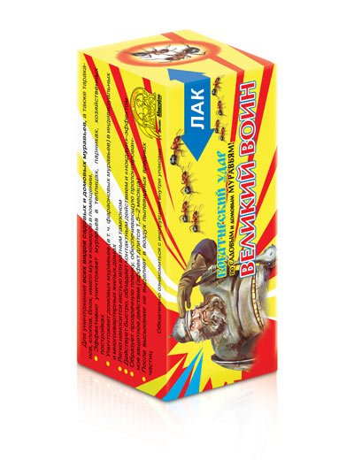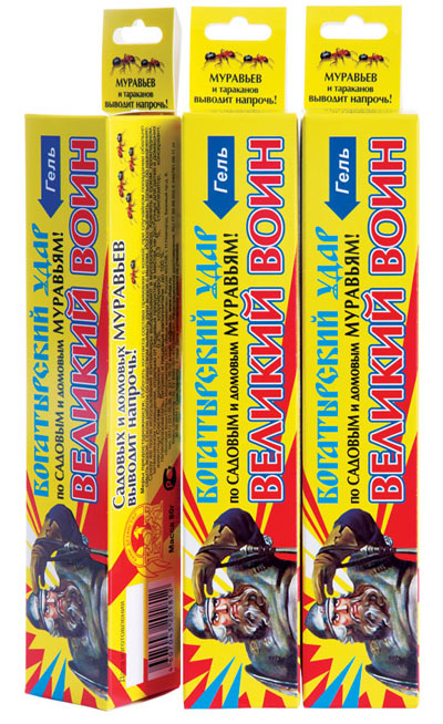 Ситуация кардинально меняется благодаря новому средству «Великий Воин — гель против садовых муравьев». Этот гель — приманка с двумя веществами, губительными для муравьев. Специальный состав ее так привлекателен для насекомых, что рабочие особи не только охотно поедают ее сами, но приносят в муравейник и кормят личинок. Благодаря этому уже через несколько дней погибает вся муравьиная колония.